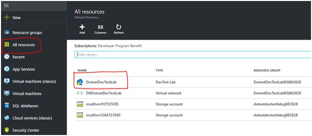 Navigate to the Azure Management portal and go to “All Resources” and click DevTest Labs that we created in our previous article.