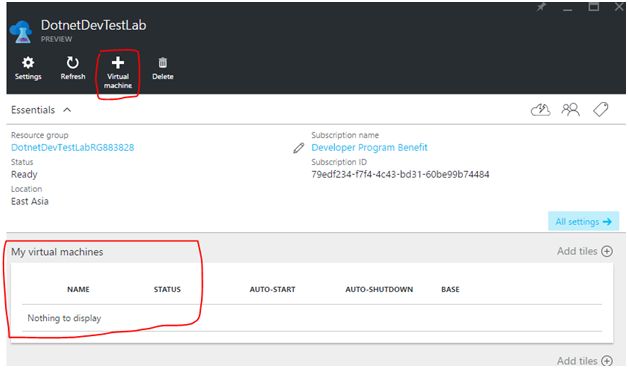 There are no VMs currently created in this DevTest Lab, as shown in the above screenshot. Let’s go ahead and create a new Virtual Machine.