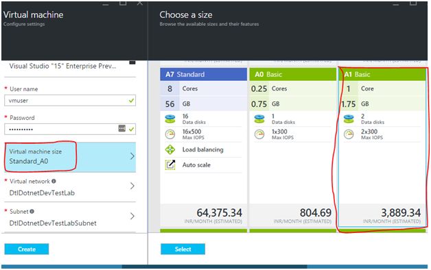 By default, “Standard_A0” is selected, which is a bit costly. Let’s change the size of the VM to A1 Basic, as shown below: