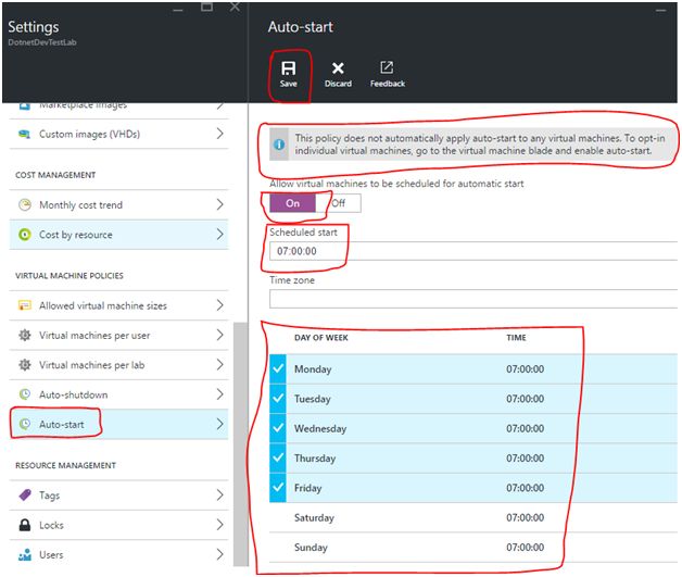Auto-Start – The last policy is to start the VMs automatically. We cannot configure this while creating the DevTest Lab. However, we can configure this one the DevTest Lab is being provisioned. As shown below you can configure the Auto-Start settings by providing the following details.