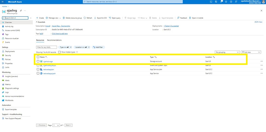 Here, we can see there are four services running – the storage account - “ojashstorage”, the Event Grid System Topic - “ojashwebsystopic”, the app service plan - “testwebappplan” and the app service - “testwebappojash”.