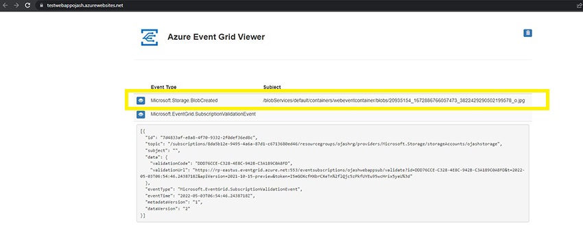 Now, visit the web app and here we can see the details of the event now. The Storage blob storage created event is shown as the image is uploaded. We can also get the details of the subscription validation event.