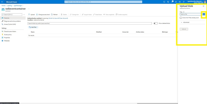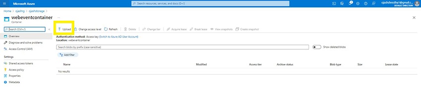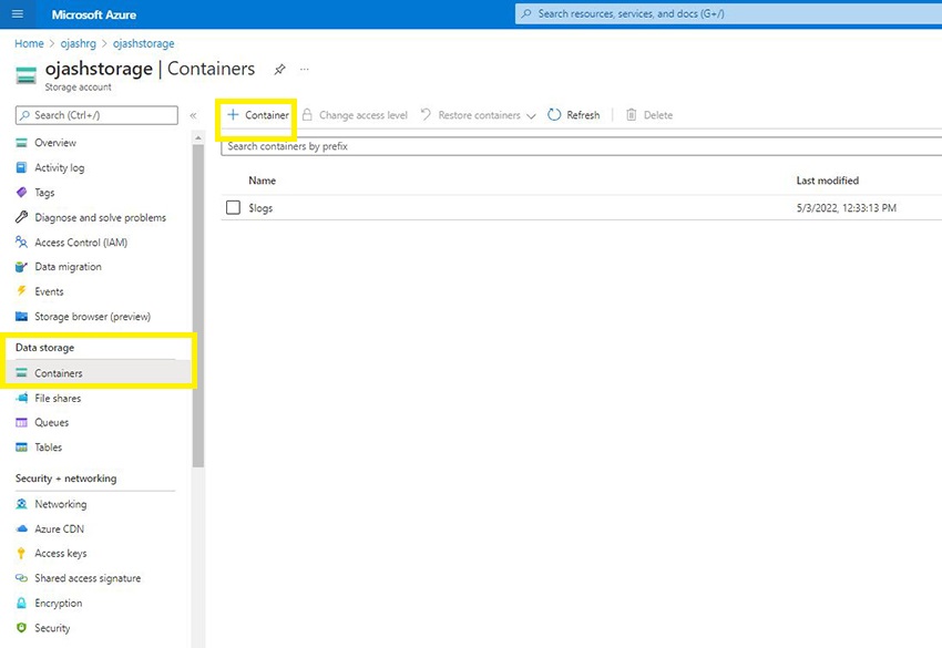As we check the containers under the storage account, we can see the new container name listed here. Click on it.