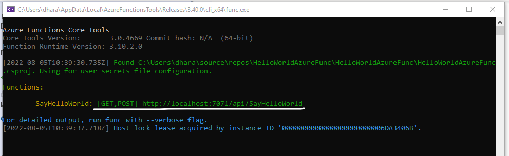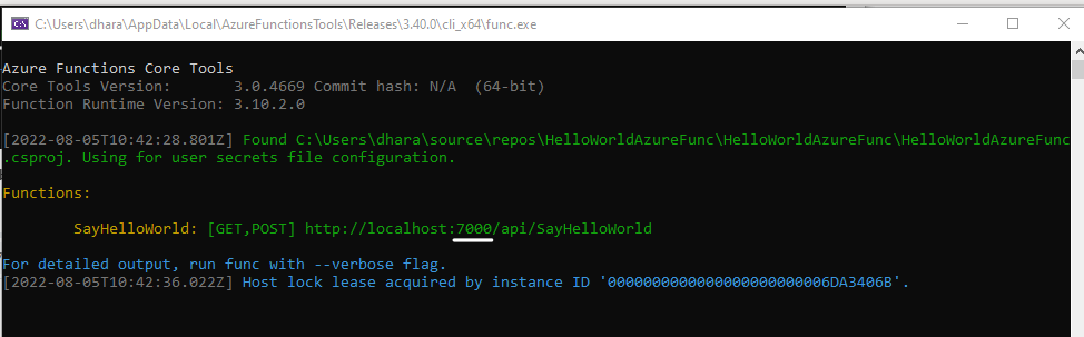 Notice the default port used by azure functions is 7071, if you wish to change it, you can go to project properties, and use “start –port 7000”