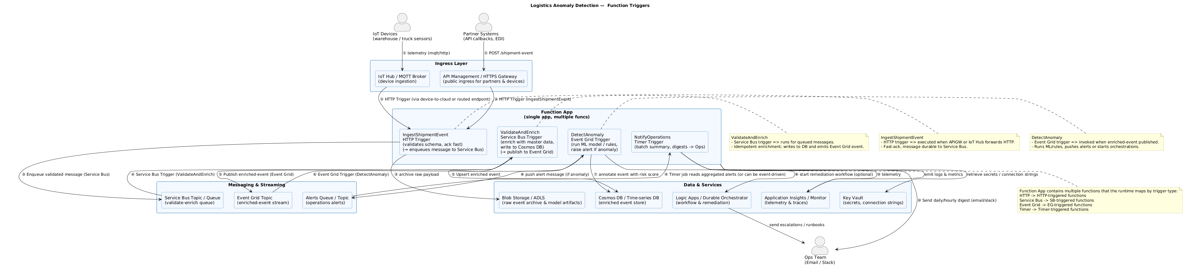 Place each function in its own class file (e.g., IngestShipmentEvent.cs, DetectAnomaly.cs)