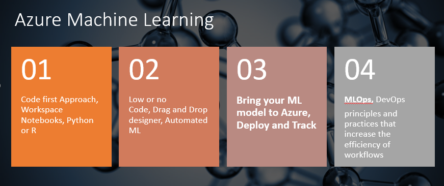 Azure Machine Learning is a cloud-based platform for designing complete machine learning solutions where you can design, deploy, evaluate, automate, maintain, and track the models. Machine Learning Studio is a cloud-based, integrated development environment where you will have your workspace to conduct ML experiments. The platform can handle all scenarios of Machine learning, starting from Classic ML to deep learning, and is also suitable for supervised as well as an unsupervised approach. You can go for code first approach with the full flavor of writing Python or R code with the SDK. You have the option to create a workspace with notebooks (Jupiter Notebooks), taking full advantage of Python code, likewise for RStudio.