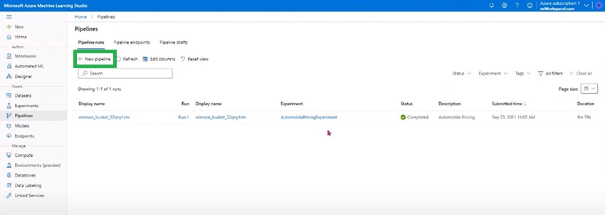 We now create a new Pipeline by selecting the New pipeline as shown below.