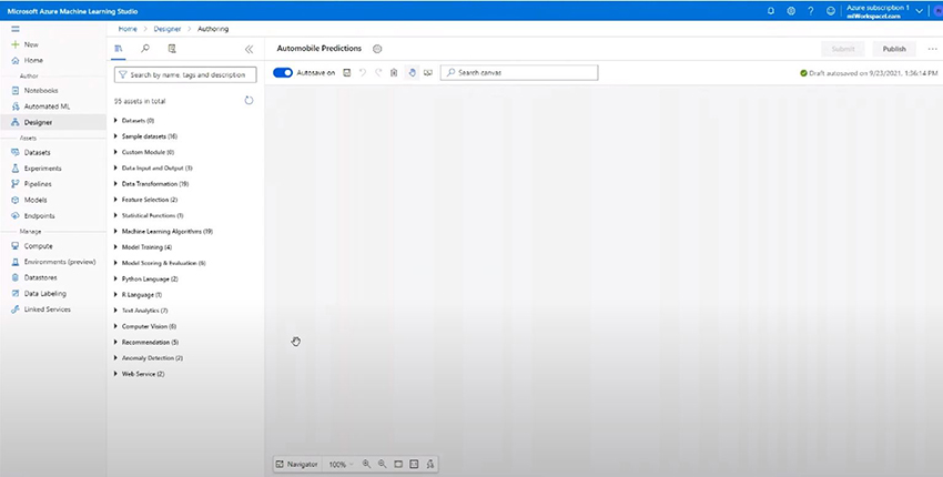 We’ll now be presented with the blank canvas to create our machine learning model through drag-and-drop process; a complete low code approach enabled by Azure.