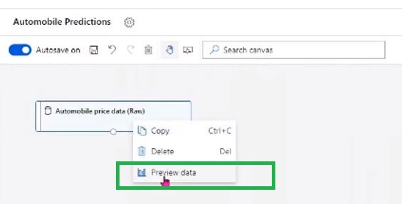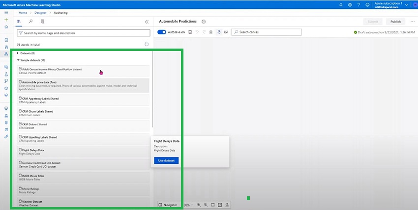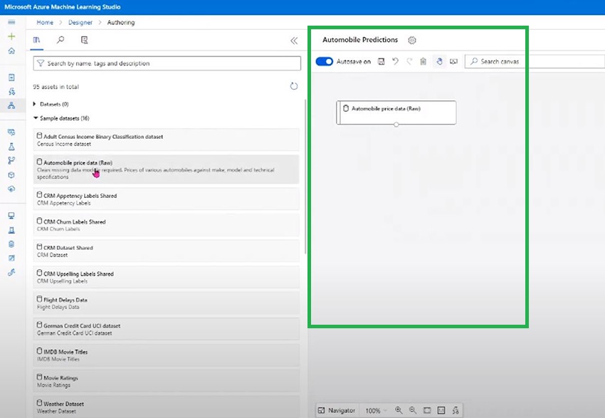 Now, to start the project, we initiate with the Dataset we want to use. For our Automobile Price Prediction, we use the Automobile price data (Raw). This can be obtained under the Sample datasets section.