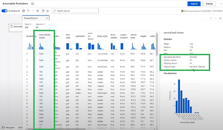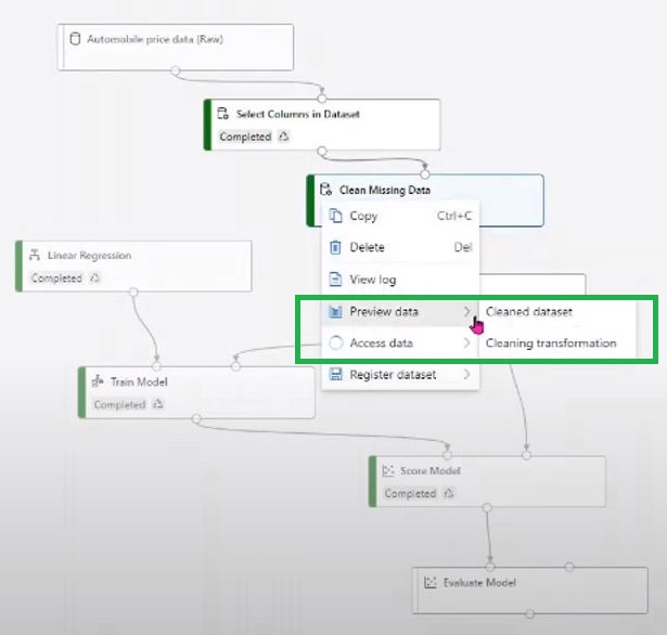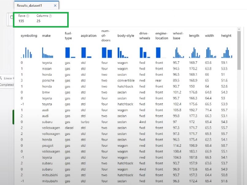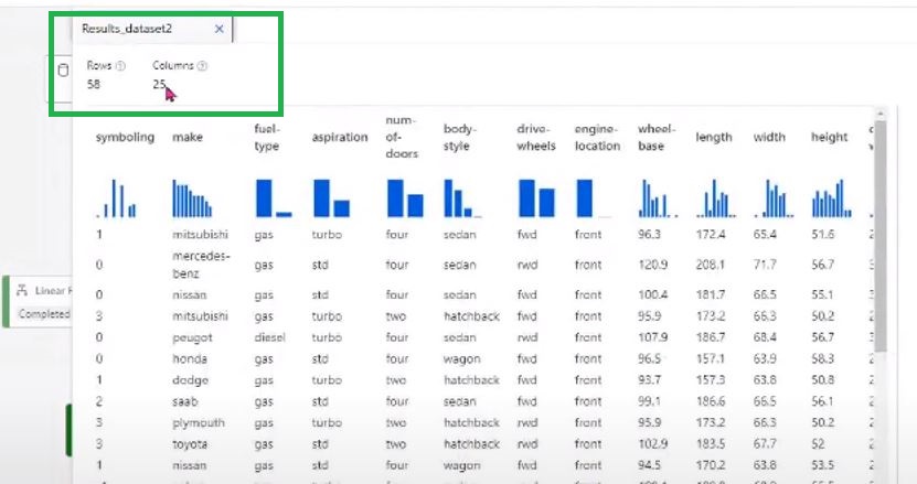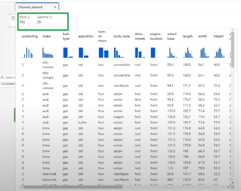 We can explore the datasets from Preview data. For example, in Clean Missing data, we can see, we now have 193 rows where we initially had 205. Also, we have removed the 1 column of normalized loss which had huge number of missing data.