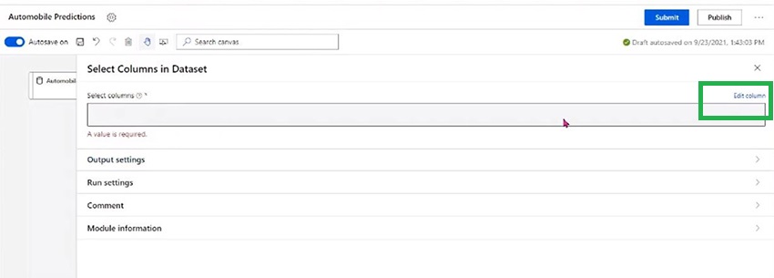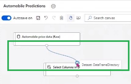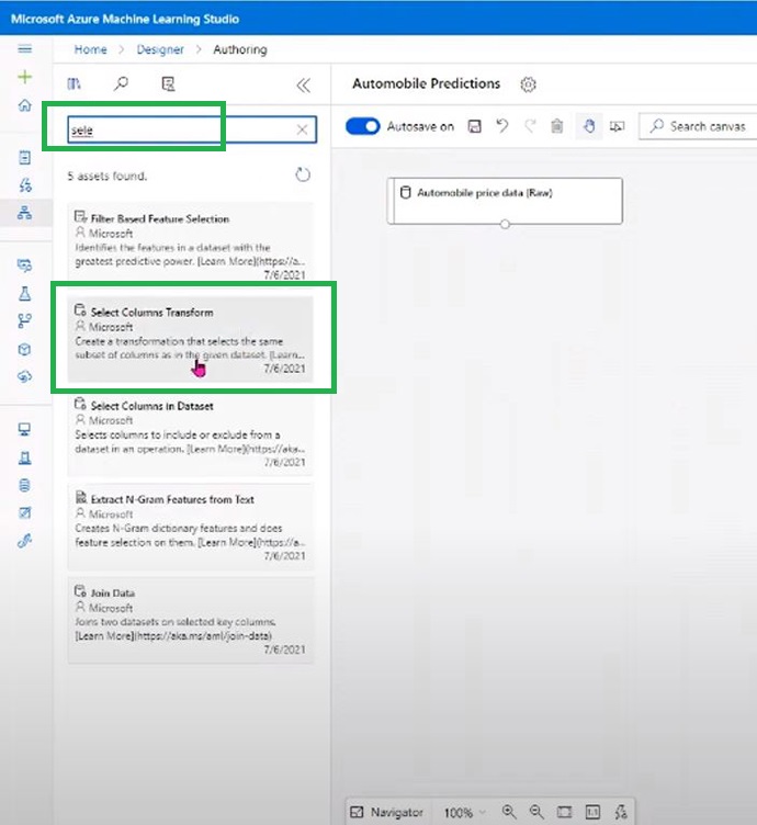 We now connect the Select Columns Transform to Automobile price data. This is important before we perform any operations on the section to transform our data.