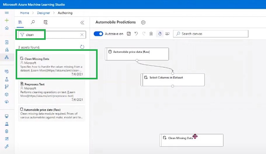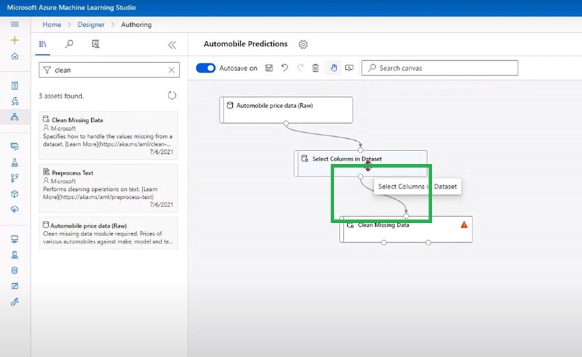 Drag and Drop the Clean Missing Data into the canvas and Connect it with the above section.
