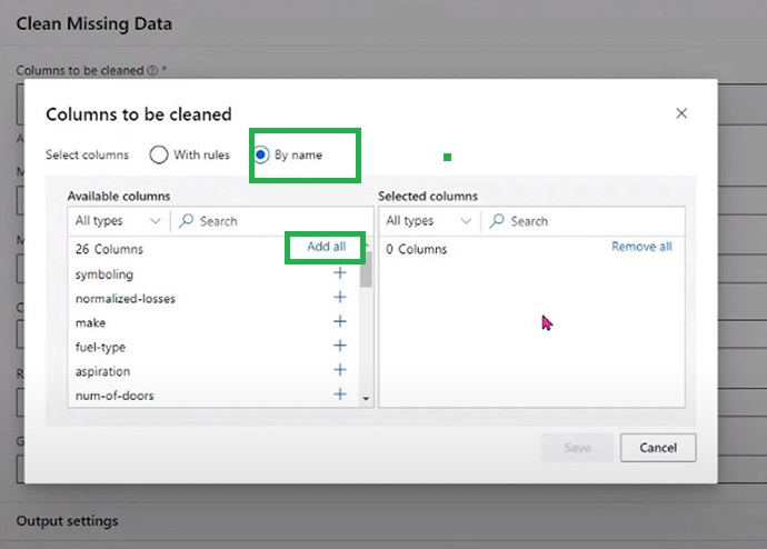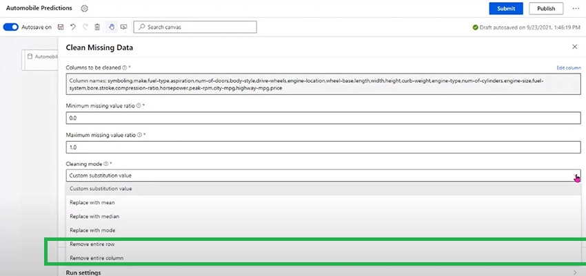 Now, under the Cleaning mode, we can see different options from Replace with mean, median and mode. Moreover, we have a better option to remove the entire column. Removing a few rows will not much affect our model as we have fewer missing data on the rows. Hence, we select remove the row.