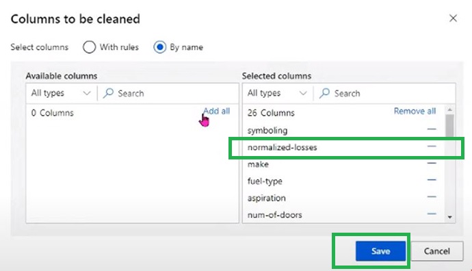 Here, we choose add all and then for normalized losses specifically, remove it from including in our data to perform any operation since it had huge number of missing values while the rest had only a few.
