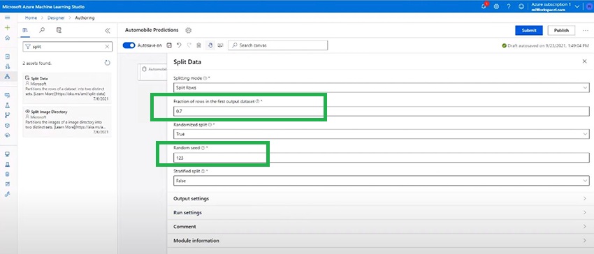 It is a normal convention to split 70-75% of data for model training and the remaining for testing. Here, we set the Fraction of rows in the first output dataset to 0.7 and Random seed to 123.