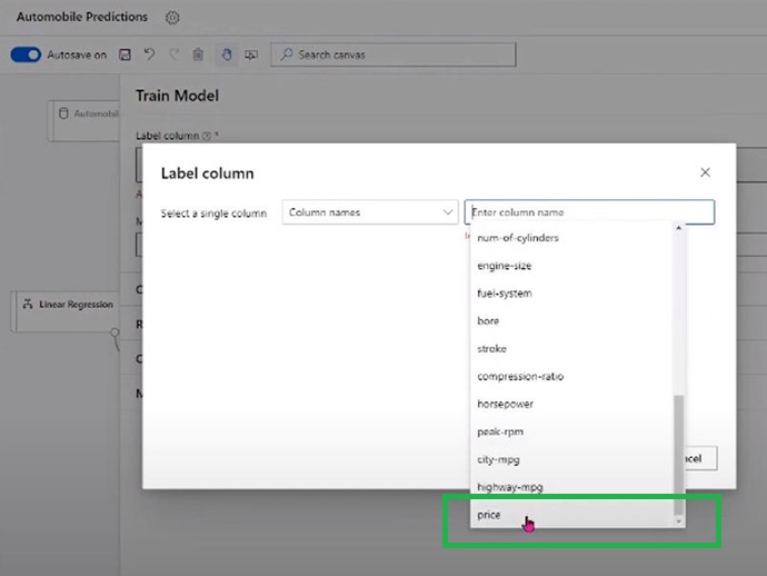 Now in Train Model, we select the Price to Label column. In this project, we are performing a regression model in order to obtain a predictive price from machine learning.