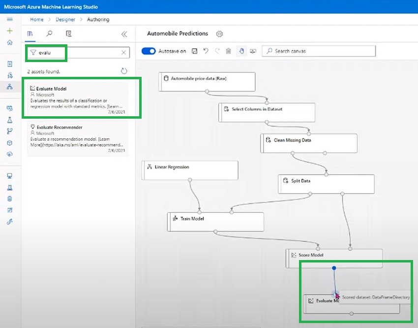 Finally, we evaluate the model. Search for evaluate and connect the Evaulate Model to the output of Score Model.