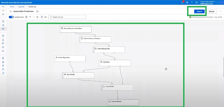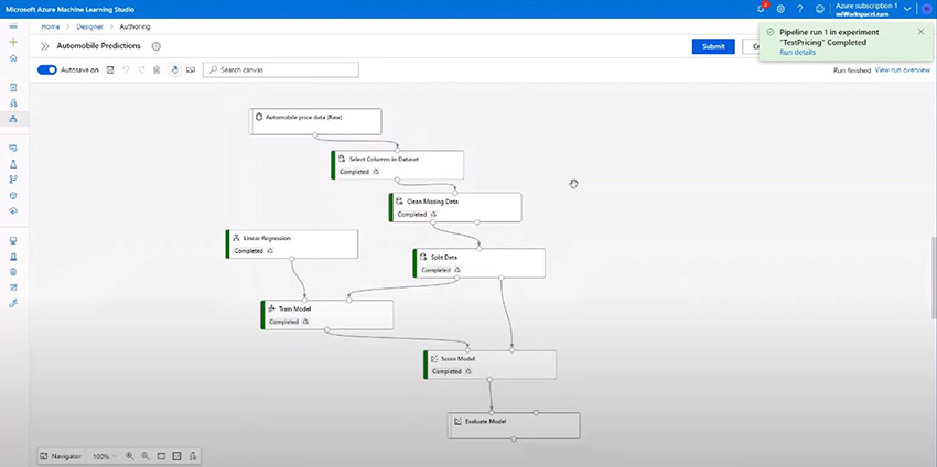 Thus, in this article, we went through a step- by-step tutorial to build a machine learning model for Automobile Price Prediction using Linear Regression. We used the low-code functionality provided by Azure, its sample dataset of automobiles, and even scored and evaluated our predicted outcome which resulted in a 0.867 coefficient which can be regarded as highly successful to build such a machine learning model.