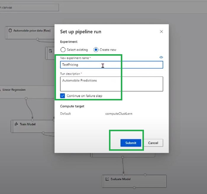 Set the experiment name to TestPricing and Description to Automobile Predictions and Submit.