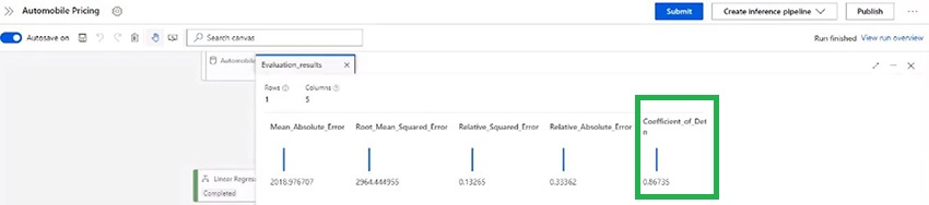 When we view the evaluation result, we can see, various values obtained. Majorly, we can see the Coefficient is 0.867. More it is near to 1, it's better. This showcases our experiment was highly successful and we’ve now built a model to predict the price of automobiles. We can now use this model to predict the price of any other automobiles.