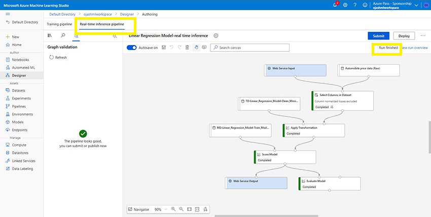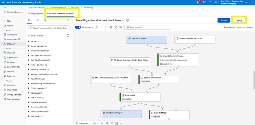 Now, above the canvas of Real-time inference pipeline click on Deploy.
