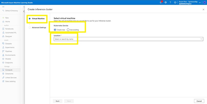 Here, under Virtual Machine for Kubernetes Service, Click on Create New and select the Location.