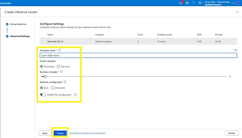 Name your compute. Here I’ve named my ojash-akscompute. Set the Cluster purpose to production – this will set it for production environment which we can use for real world usage. Number of nodes can be set to 3. Set the Network Configuration to Basic and then click on Create.