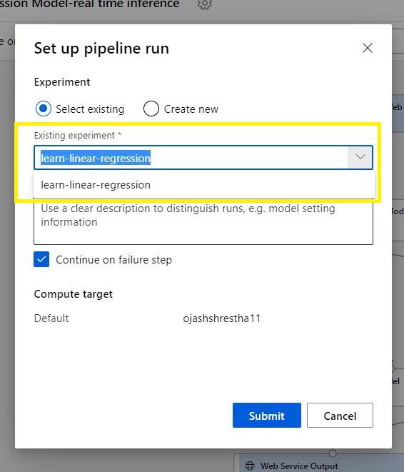 We need to select our experiment under our compute target. Here, mine is the learn-linear-regression. I’ve also added the job description which will be useful when we look at it later.