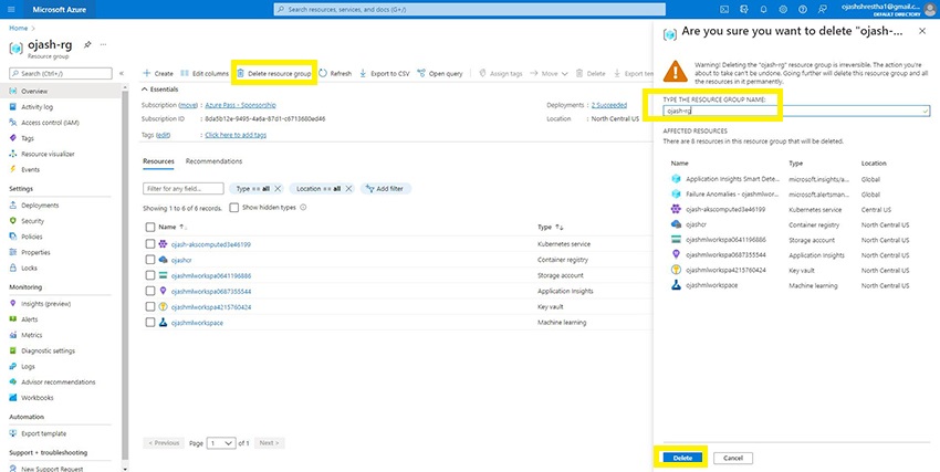 Click on Delete Resource Group and retype the resource group name and finally hit the Delete button.