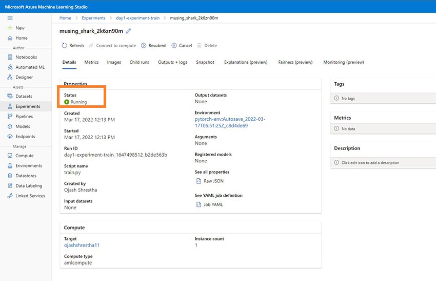 Here, we can see the experiment musing_shark_2k6zn90m is running.
