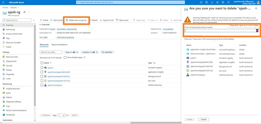 It is even better to delete the resource group from the Azure Portal which will completely wipe all the resources that were created under the resource group. Here, we can see, the Machine Learning Workspace, Key Vault, Storage Account, Application Insights, Container Registry were all created within the ojash-rg resource. I click on Delete Resource Group and reconfirm with typing the name of the resource group and click on delete to remove the resource group and all its containing resources.