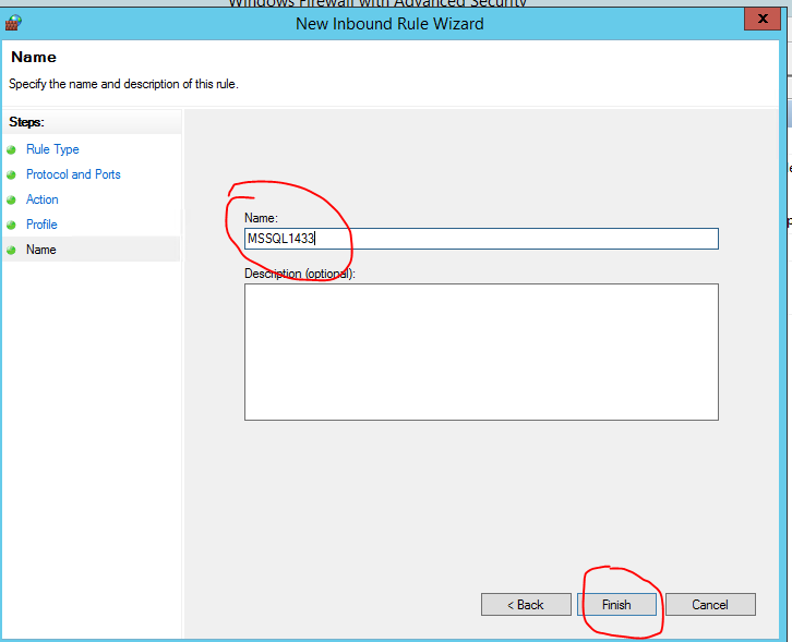 The final step is to provide a name for the rule. Let's name this to MSSQL 1433 as shown below and click on "Finish".