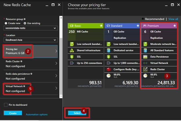 You must choose one of the available Premium Tiers. In this example, I have selected P1 Premium tier. Once you select the required tier, click Select. The next step is to configure the Virtual Network in which you would like to host and use the Redis Cache.