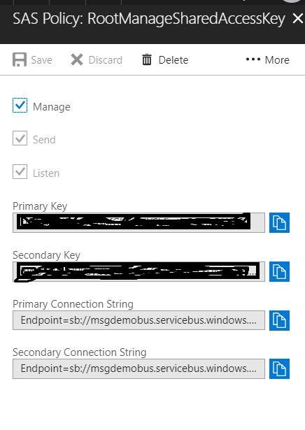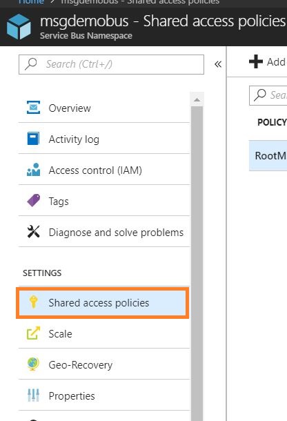 _serviceBusConn will hold the Azure service bus connection string, we can get a shared access Name and key from Azure service bus shared access policy as showed in the below figure.