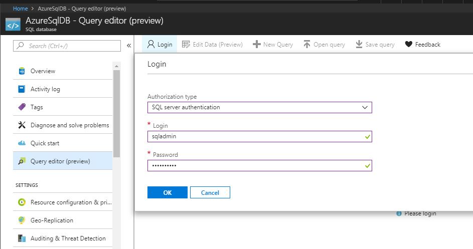 Click on the "Query editor ( preview)" and Click on the "Login" and it will display a Login portal for accessing our Azure SQL Database in Azure. So give or appropriate database credential into it. Once it’s done Click on "OK" button.
