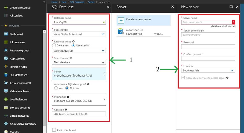 After clicking the “SQL Database”, it will open another section. There, we need to provide the basic information about our database like Database name, Storage Space, Server name, etc.