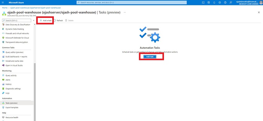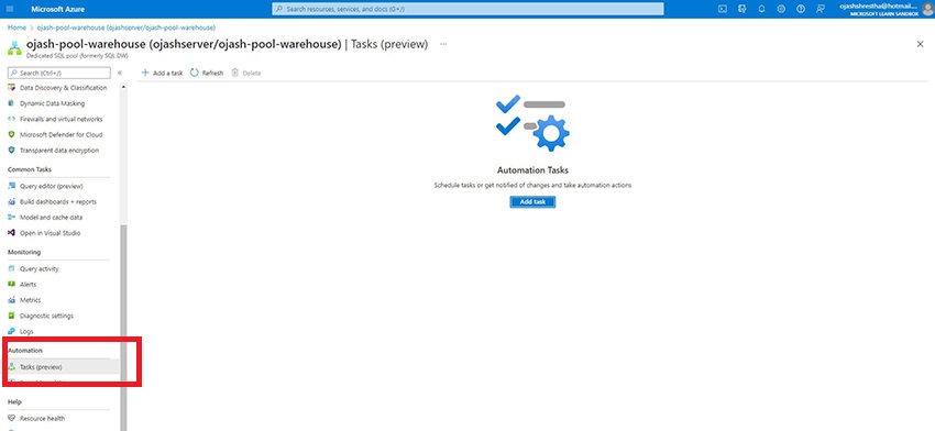 On the SQL pool resource page, click on Tasks under Automation. This will take you to the Tasks page.