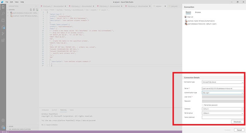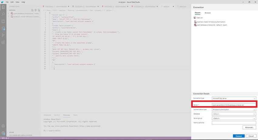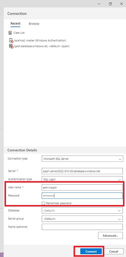 Here, fill in the Server name that we copied earlier. Set the Connection type as Microsoft SQL Server.
