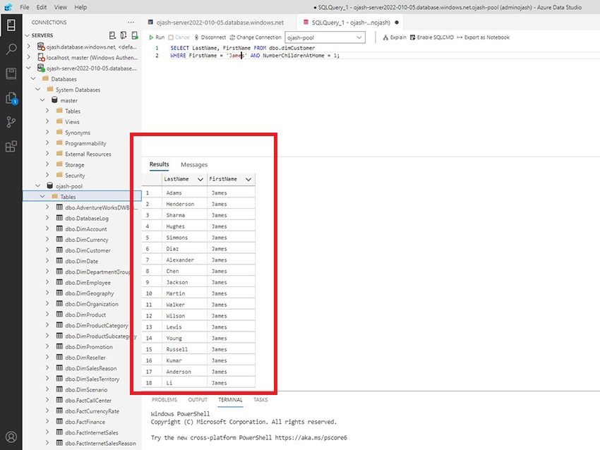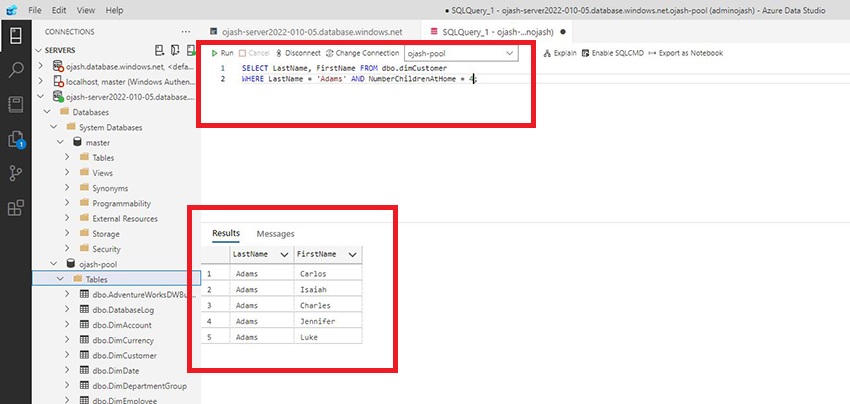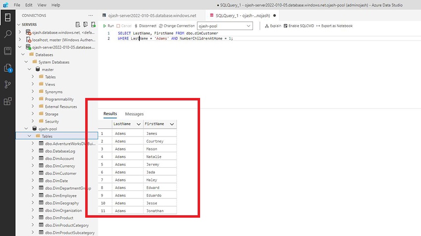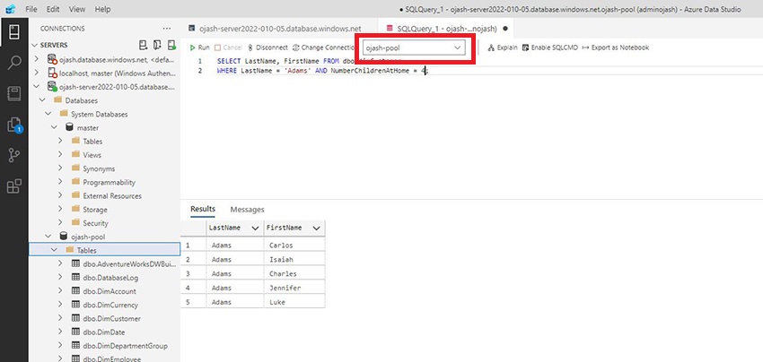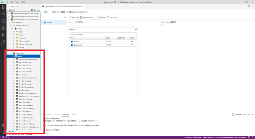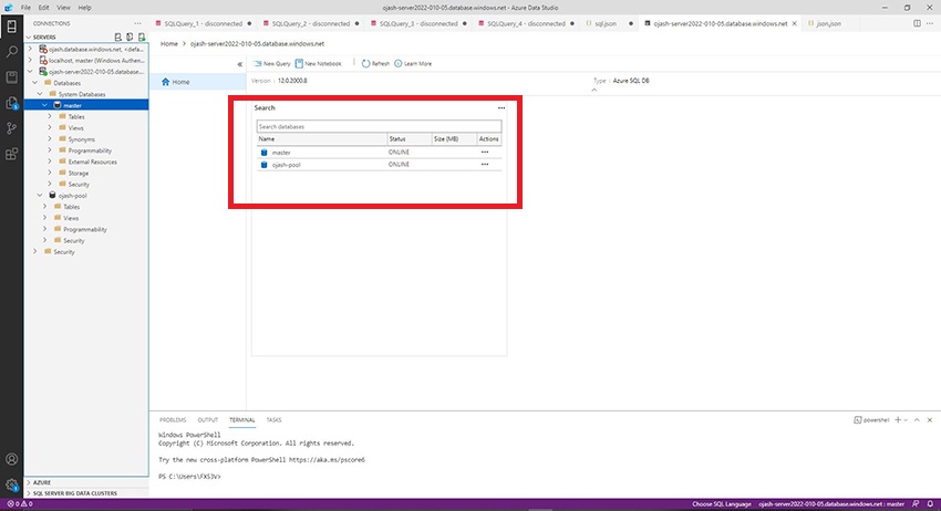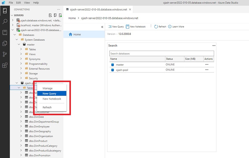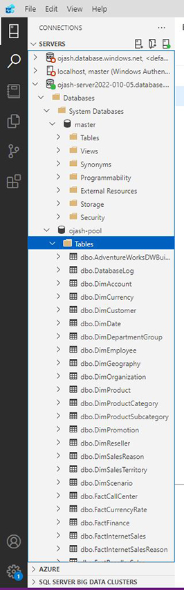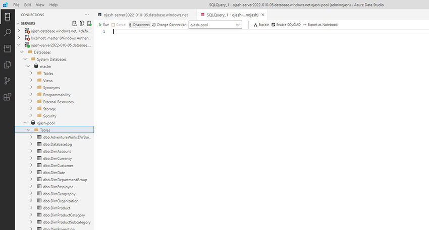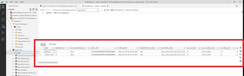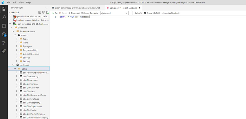 Now, the Azure Data Studio will be connected to the server which consists the data warehouse SQL pool we created. Here, we can view ojash-pool with the status ONLINE.