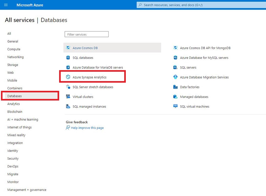 Next, go select the Databases on the left-hand side and hover over Azure Synapse Analytics.