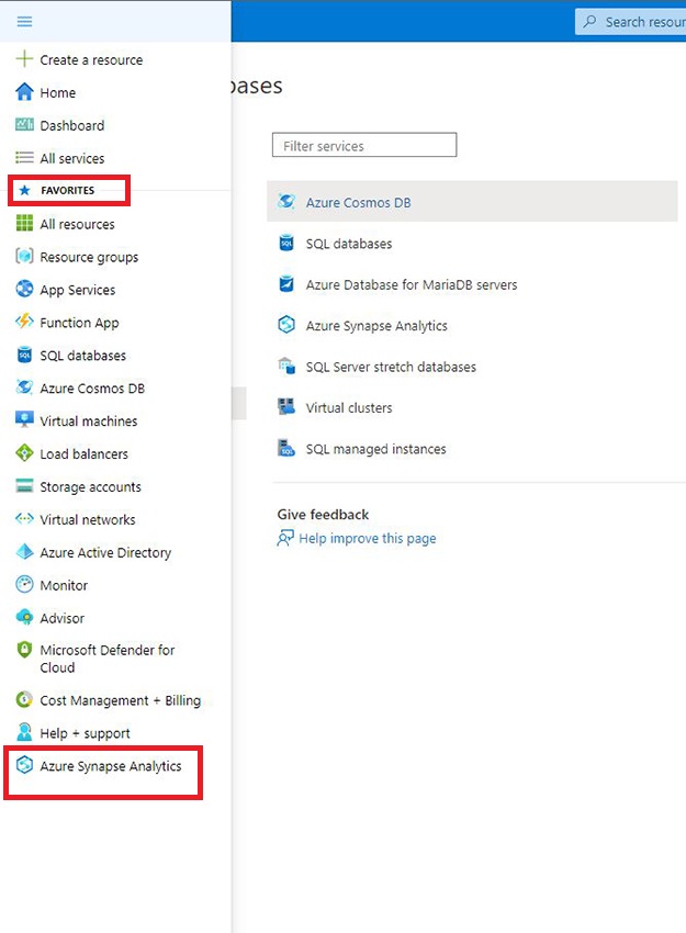 Now, we can see, we can access the Azure Synapse Analytics from the Favorites in the Menu.