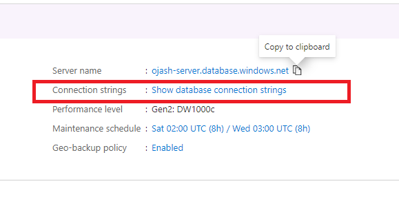 Here, we can see the Server name, Connection Strings the other details. On the side of Server name, we can see the Copy Button using which we can connect this server to any services such as Azure Data Studio.