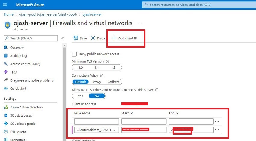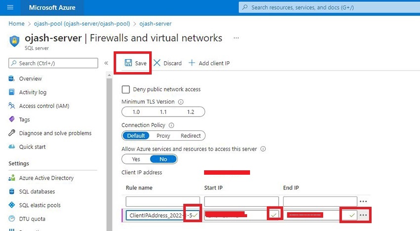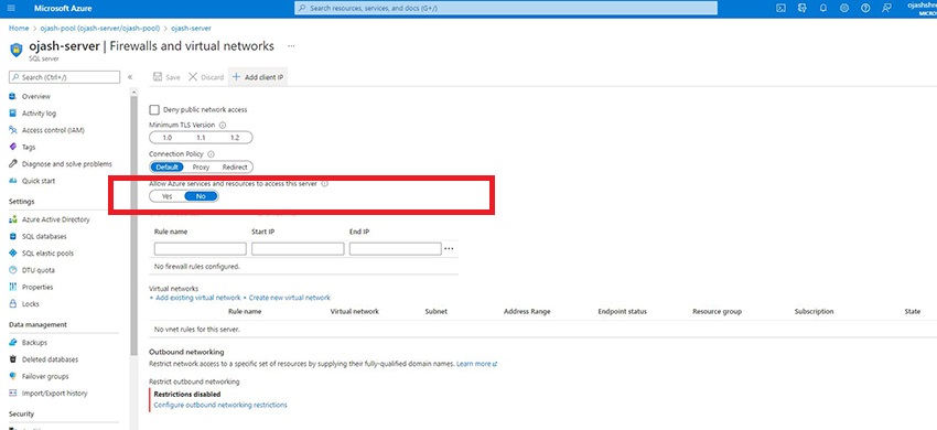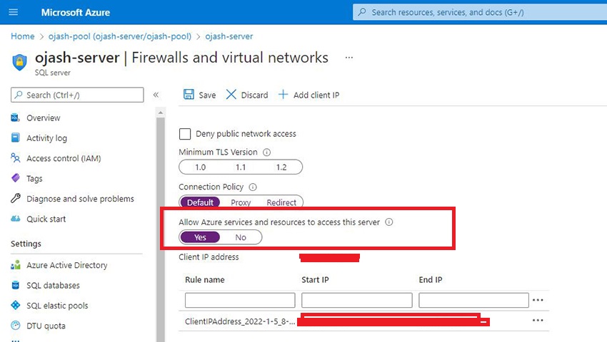 Make sure, the Yes is selected in Allow Azure service and resources to access this server. Otherwise, we cannot access this server.