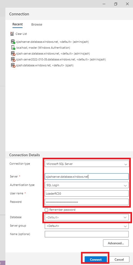 Here, the Server is the same Server we created in Azure that contains the ojash-pool-datawarehouse. Under the Authentication type, select SQL Login and the username must be the one we just created – LoaderRC30 or LoaderRC60 and put in the password you set. Next, under Database select the database you created the user under. Here, we’ll select the ojash-pool-datawarehouse.
