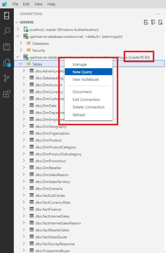 Here, we do it on ojash-pool-datawarehouse and create a new Query window.