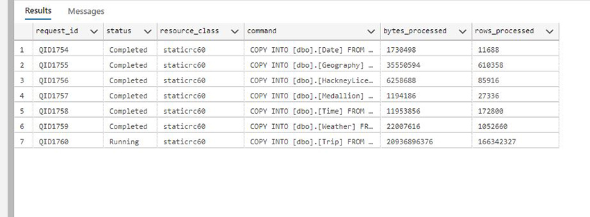 As the data is loaded or is in process, type in the following query which uses Dynamic Management View and shows the loading status.