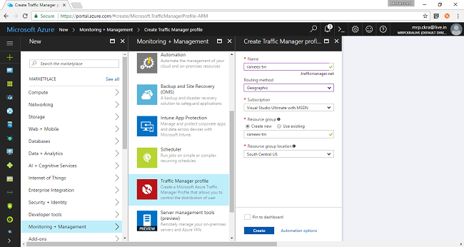 Next create a unique traffic manager profile with a unique DNS and a TTL. As traffic manager will assign a domain name with .trafficmanager.net it has to be unique