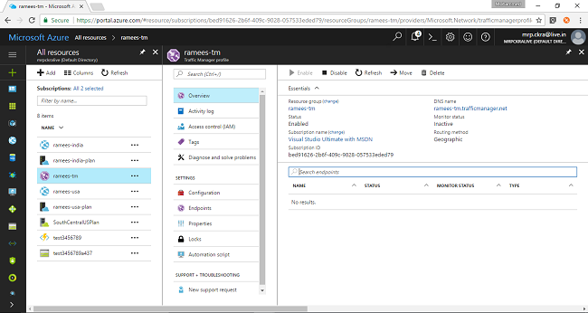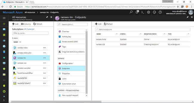 Now we have two endpoints added to our traffic manager and we can have as many as we require. Now let us test our demo. If you navigate directly to each endpoint's direct URL it will be showing the corresponding page from the servers only. To make use of the traffic manager you have to use the traffic manager URL instead so that the traffic manager will decide the endpoint.