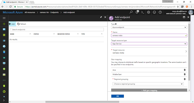 Select the endpoints section to add endpoints. While trying to add it will ask for a name to the endpoint, target resource type and will prompt for selecting from the available resources. As we have selected geographical for routing method here we can define for which regions we can assign the corresponding end point.