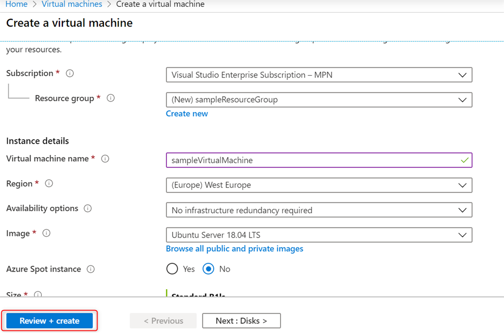 Using Windows Server as Operating System with 2012 R2 image and with machine size set as Stardard B1.